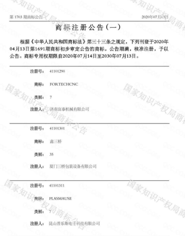 此次“PLASMAUSE”商標的成功注冊,推進了普樂斯品牌形象的提高,對普樂斯公司核心競爭力和抗風險能力的提高都大有益處,相應程度保障普樂斯在市場環(huán)境中可以有序、健康地發(fā)展。商標發(fā)展戰(zhàn)略也展現(xiàn)了普樂斯對于等離子清洗機品牌的注重還有塑造匠心拳頭產(chǎn)品的決心。